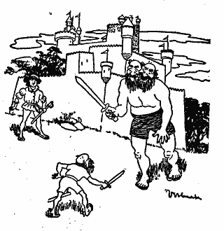 Jack was too brave to run away, so he stood by the little red man till a great and terrible giant came to the gates and opened them, and asked them what they wanted.