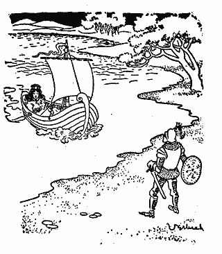 He stood his ground, as the boat was coming straight toward him. At length the boat's keel grated on the gravel, and Ciad helped the young lady on shore. He said: "Beautiful lady, who are you? Where do you come from? Or where do you go all alone?"