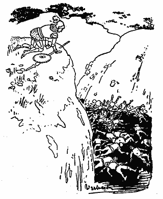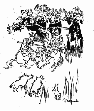 Then he raised his spear, and he and the Feach went at the fight. The noise and the din and the fierceness of the fight was such that the boars came down from the hills, and the deer came up from the valleys, and the birds from the woods of the world loaded the tree tops around, to watch. If Feach-An-Chruic was a great fighter, Feach-An-Choille was a far greater, but as great as he was, Ciad's courageous spirit was still greater, and when the sun was behind the trees in the west, Ciad put the Feach down.