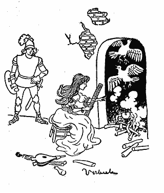 Ciad thought this very strange and that he would go in and find out what it meant. Inside he saw a very beautiful young lady sitting by the fire. She had in her hand a wand covered with scales. She was plucking the scales from it, one by one, and flinging them into the fire, and for every scale she flung into the fire a white pigeon got up and flew from the chimney.