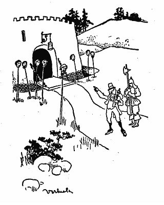 In a very little time the King and the King's daughter and the King's court all came out and sat themselves down on gold and silver chairs in front of the castles and ordered Jack to be brought in until he should have his trial. Jack, before he went, took out of his pocket the bee, the harp, the mouse, and the bum-clock, and he gave the harp to the bee, and he tied a string to one and the other, and took the end of the string himself, and marched into the castle yard before all the court, with his animals coming on a string behind him.