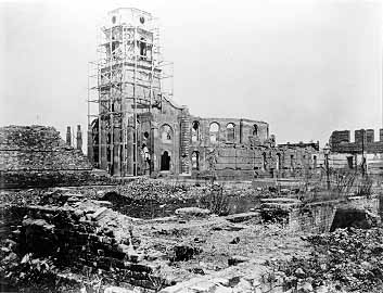 The small, black cubical tent partly visible in the ruins on the right is Barnard's portable field darkroom.