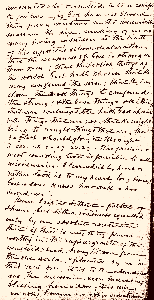 Excerpt from Sorin's Additions or Reminiscences (1880). . . amounted to and resulted in a complete failure, if God had not blessed their puny exertions in the undeniable manner he did, making of us so many living witnesses to the truth of his apostle's solemn declaration, that the weakness of God is stronger than men; that the foolish things of the world God hath chosen that he may confound the wise; that he hath chosen the weak things to confound the strong; and the base things and the things that are contemptible hath God chosen, and the things that are not, that he might bring to nought the things that are, that no flesh should glory in his sight -- I Cor., 1, 27-29. This precious and most consoling text is familiar to all missionaries. I learned it by heart, or rather took it to my heart long since. God alone knows how well it has served me. Hence I repeat without a particle of shame, but with a readiness equalled only by an absolute conviction, that if there is anything praiseworthy in the rapid growth of the mustard seed brought over from the old world and planted by us in this new one, it is to the abundant dew, the incessant and ever increasing blessing from above that it is due. Non nobis Domine, non nobis, sed Nomini . . .