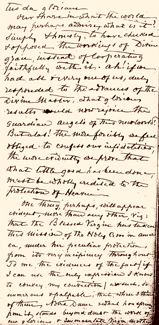 Excerpt from Sorin's Additions or Reminiscences (1880). . . tuo da gloriam. Our share in what the world may perhaps admire, what is it? Simply and honestly, to have checked and opposed the workings of divine grace instead of cooperating faithfully with it. Ah! if we had all and every one of us duly responded to the advances of the divine Master, what glorious results would new rejoice the guardian angels of this New World! But alas! the more forcibly we feel obliged to confess our infidelities, the more evidently do we prove that what little good has been done must be wholly credited to the protection of Heaven. One thing, perhaps, will appear evident more than any other, viz: that the Blessed Virgin has taken this mission of the Holy Cross in America under her special protection from its very incipiency throughout. To me the evidences of the fact /if I can use the only expression I know to convey my conviction/ are such, so numerous and palpable, that, when I think of them, Notre Dame and what has sprung from it stands beyond doubt the work of our glorious and Immaculate Virgin Mother.