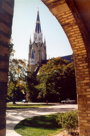 Basilica of the Sacred Heart Viewed through brick arch in Main Building