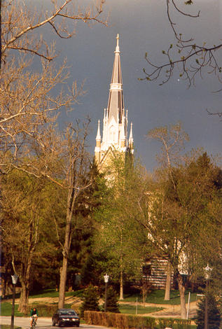 Church Steeple and Log Chapel at Twilight