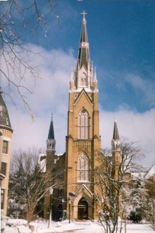 In 1871 the cornerstone for the church of Our Lady of Sacred Heart was laid. The longer name first selected for the new Notre Dame church was later shortened to Sacred Heart. By the decree of Pope John II, the Vatican named this second church built at Notre Dame a minor basilica on November 23, 1991. The church can now use the title Basilica of the Sacred Heart. |