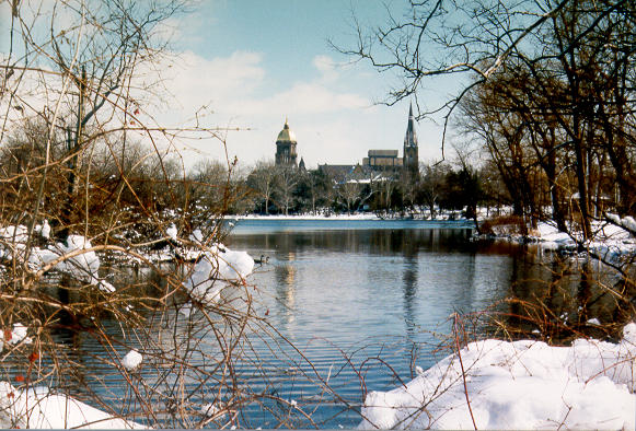 A few hours after [our arrival in South Bend], we came to Notre Dame, where I write you these lines. Everything was frozen, yet it all appeared so beautiful. The lake particularly, with its mantle of snow, resplendently white, was to us a symbol of the stainless purity of Our Lady. . . . Our accommodations here appear as indeed, they are -- but little different from those at St. Peter's. We hurried about looking at the various sites. . . . Like little children, in spite of the cold, we ran from one end to the other perfectly enchanted by the beauty of our new home. . . . We found the place too small to accommodate us for the night. And as the weather was becoming colder, we hurried back to the village, where we stayed that night. -- Sorin to Moreau, December 5, 1842, first letter written by Sorin from Notre Dame. Circular Letters of Fr. Sorin, pp. 259 ff.