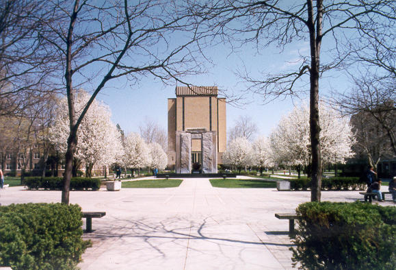 Hesburgh Library in the Springtime Amid blossoming trees on Fieldhouse Mall