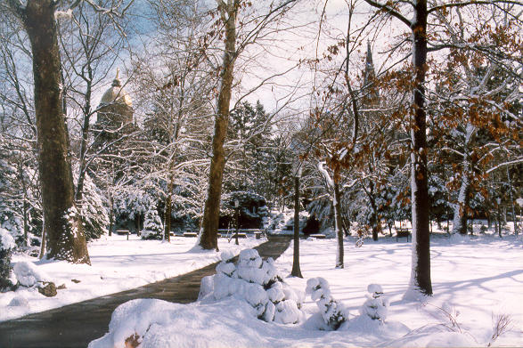 "And now it is December. The trees that shade her in summer, yawn their nakedness into the cold blue sky. Mossy beds of flowers that usually stretch over the rocks to her niche are tangled dry weeds. The cracking coldness of the season numbs the iron kneelers at her feet and causes lighted candles beyond to sputter and jump casting leaping shadows on the Grotto walls. But she is not alone. Even when the heavy snow will bury the weeds and clutch the tree trunks she will not be without visitors." -- Notre Dame Scholastic, 73:9 (1 January 1939). |
