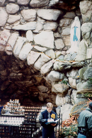Wrought iron fence arrow near Sean's shoulder points to the small black stone from Lourdes above it.