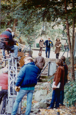 Rudy camera crew during filming on campus Sean Austin (as Rudy) on steps