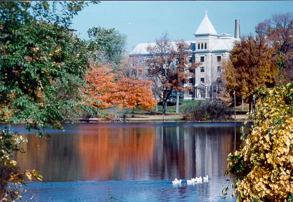 "The beautiful blue sky is arching above me like a dome made from lapis lazuli; the clear surface of the lake reflects the cheerful splendor of the sky; the manifold greens of the nearby bushes, like the fine cedar, tulip, and oak trees of the forest on the opposite side, decorate the lake, which now is viewed as the font; and the grass slope with its decoration of far-western flowers, which stretches all the way to the lake, serves as the carpet to the imposing house-chapel in God's wonderful temple of nature." -- German missionary's description of St. Mary's Lake and the newborn Indian baby he baptized there during his stay in the Log Chapel on campus in 1840.